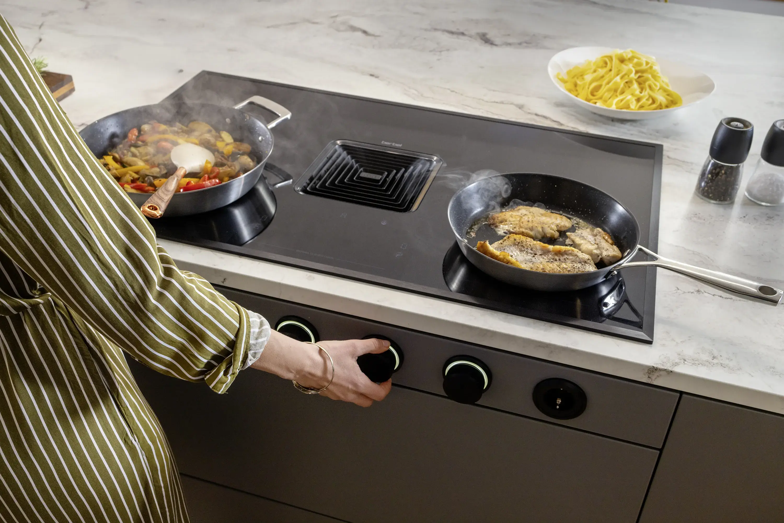 Downline Performance verbindet ein leistungsstarkes Induktionskochfeld mit einem integrierten Dunstabzug in modernem, minimalistischem Design. Direkt am Kochfeld erfasst das System Koch- und Bratdünste mit dem filterfreien berbel Prinzip über die optimierte Vertical Flow-Luftführung – so bleibt die Sicht beim Kochen frei und Räume sauber. Die Bedienung erfolgt intuitiv über einen Single-Slider oder optional über Drehknebel, während die kompakte Bauweise viel Stauraum unter dem Kochfeld erhält. Die Downline Performance ist wahlweise mit einem schwarz glänzenden oder mattschwarzen Oberflächenfinish erhältlich und bietet damit funktionale Effizienz sowie eine stilvolle Integration in moderne Küchendesigns.