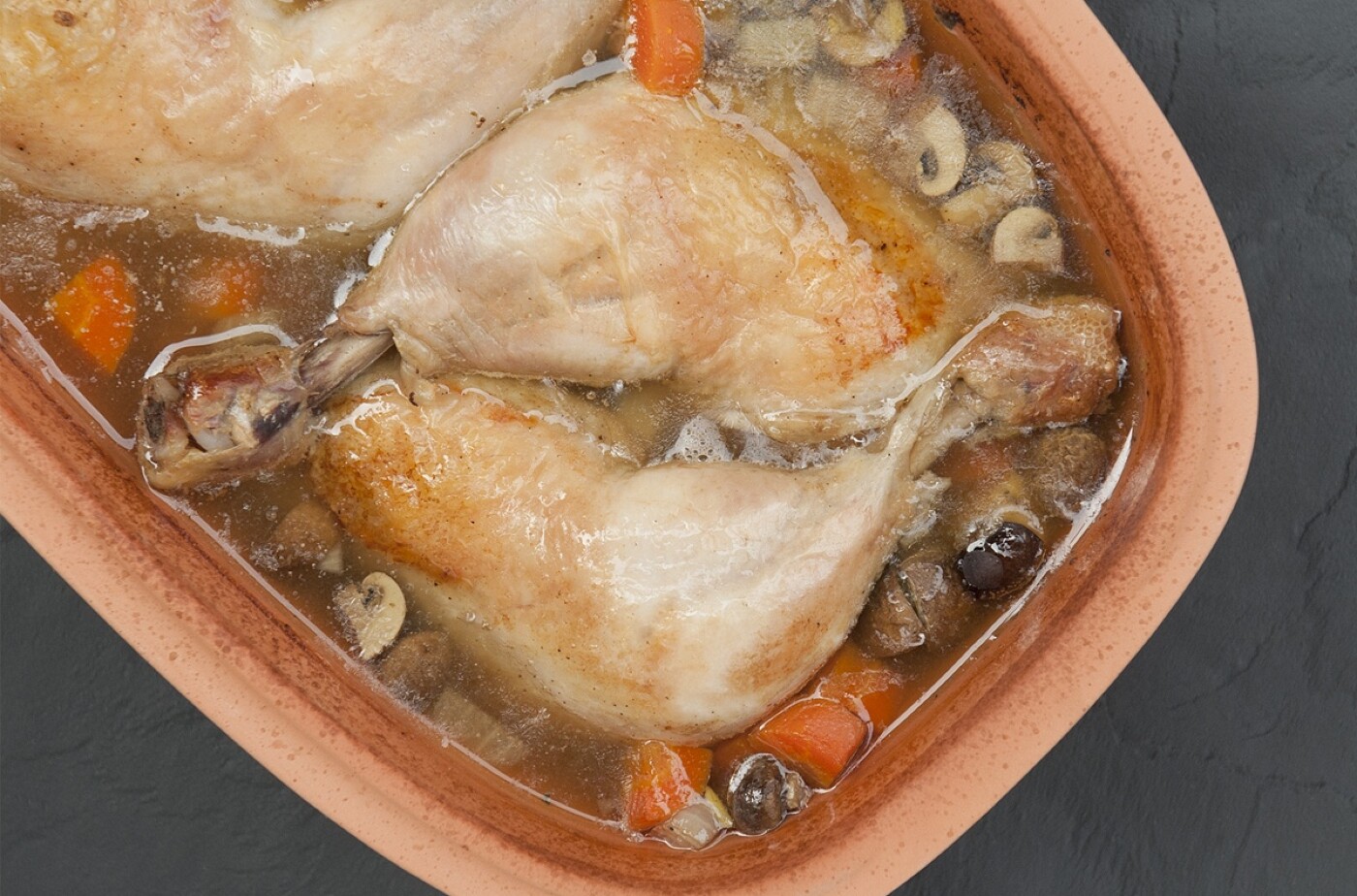 Probieren Sie auch einmal Coq au Vin aus dem Römertopf: Hähnchenkeulen salzen, pfeffern und mit Öl bestreichen. Die restlichen Zutaten wie Zwiebeln, Karotten, Sellerie, Champignons und Knoblauch mit je 1/8 Liter Weißwein und Brühe in den gewässerten Römertopf geben, die Keulen darauf legen. Deckel drauf, in den kalten Backofen stellen und bei 175° Umluft (200° Ober-/Unterhitze) rund 1,5 Stunden garen.