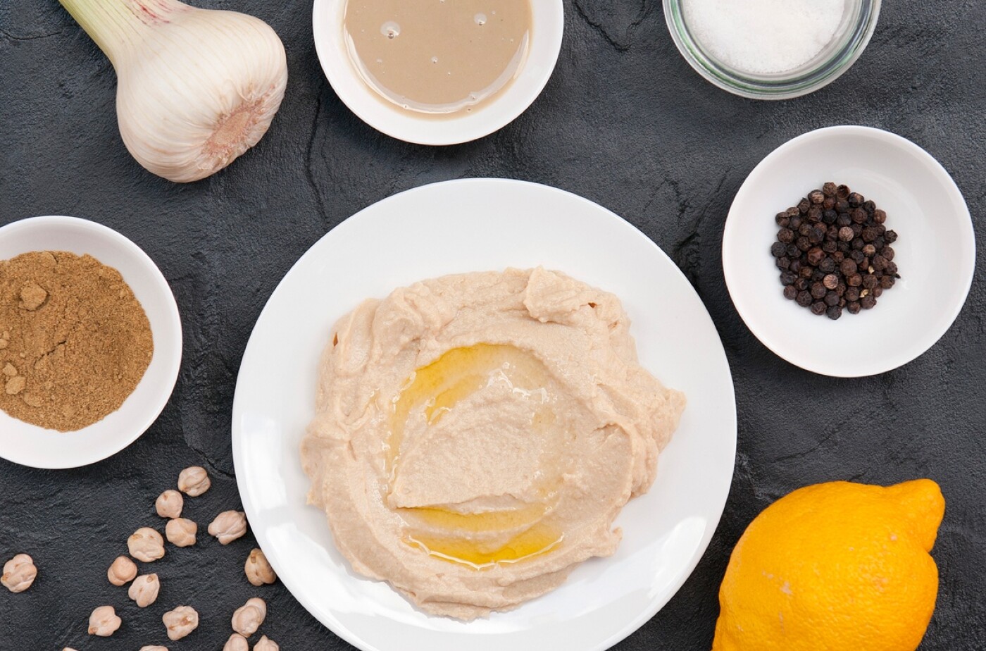 Nehmen Sie den Inhalt von zwei Dosen Kichererbsen und pürieren Sie diese. Währenddessen geben Sie 4 Esslöffel Tahini (Sesampaste, gibt es mittlerweile in gut sortierten Supermärkten), 4 Esslöffel Zitronensaft einen Schuss Olivenöl und zwei Knoblauchzehen dazu und pürieren Sie alles ganz fein. Das war es eigentlich auch schon – Sie können den Hummus noch mit Salz, Pfeffer, Kreuzkümmel oder Chili würzen, wenn Sie wollen. Decken Sie die Paste ab und lassen Sie sie 30 Minuten ruhen. Im Kühlschrank hält Hummus einige Tage.