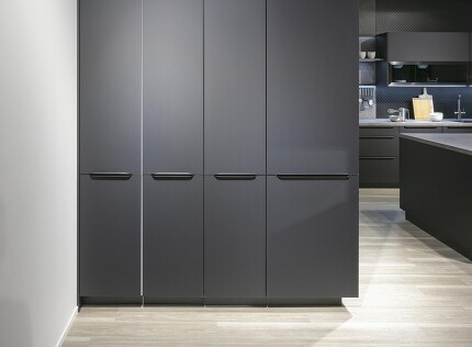 So eine L-Insel kann auch ein bisschen kompakter aufgebaut werden. Wenn Sie Feuer gefangen haben, kommen Sie einfach auf uns zu! Das gezeigte Beispiel der mattgrauen L-Kücheninsel zeigt, dass diese sich auch sehr gut für offene Küchen eignet: Die zum Wohnraum hin zeigende L-Seite wird mit Regaleinschüben versehen, in die man hübsche Gefäße stellen kann, was gleich eine wohnliche Atmosphäre verbreitet.