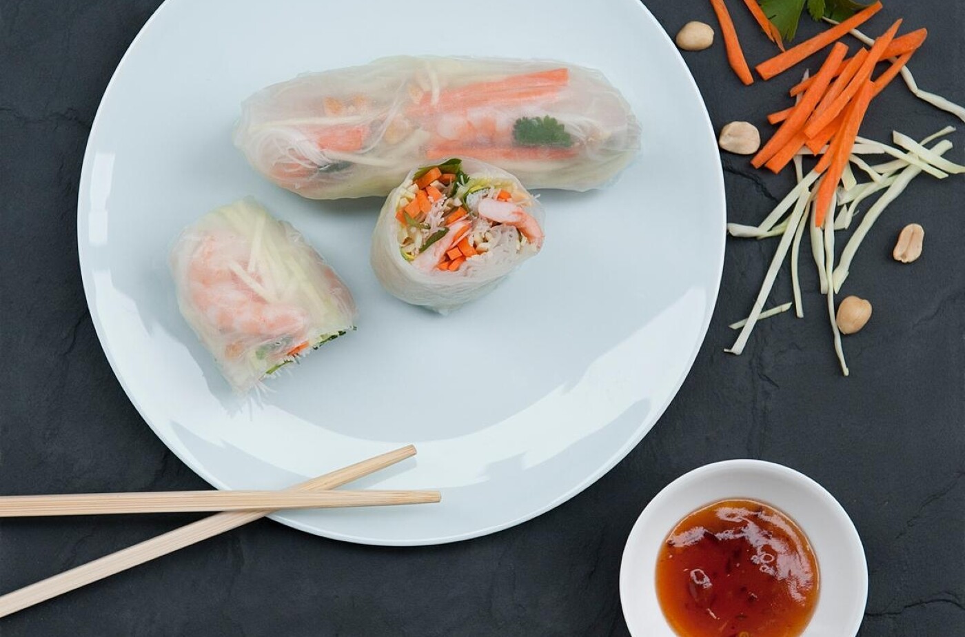 Kennen Sie vietnamesische Sommerrollen? Frisch, gesund, fettarm, wahrhaft ein leichtes Gericht: Die in schmale Streifen geschnittenen Zutaten (gegartes Fleisch oder Fisch und rohes Gemüse) werden in eingeweichtes Reispapier eingewickelt, in einen Dip getaucht und direkt verzehrt. So einfach!